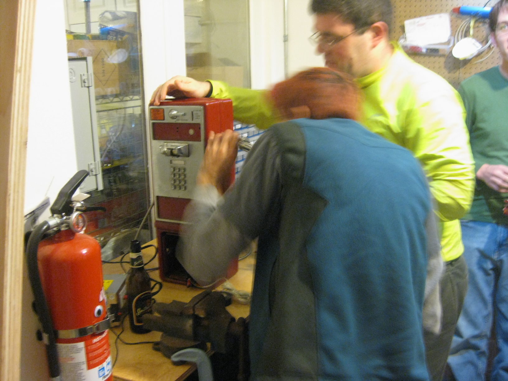 Double leathermaning their way into Noisebridge's new old red payphone.