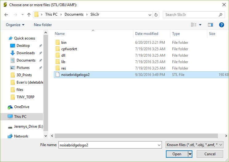 3. Choose the file you want to print (there is a test file in /Documents/Slic3r/noisebridgelogo2.stl which you can download from Thingiverse)