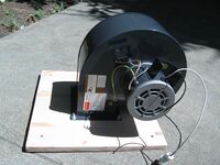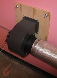The photos on the right show an exhaust fan, which I selected, configured, and installed on a laser cutter in May 2014. The laser cutter was originally delivered with a fan that was noisy and ineffective. This new fan completely stopped the problem of unpleasant odors spreading through the building. The fan delivers 500 CFM at 3" static pressure. The permanent split capacitor motor turns at only 1640 RPM, leaving the fan quiet. I used smoke pellets to analyze the circulation pattern and verify smoke did not escape into the room. Note the custom-made starting collar bolted to the right side of the fan.